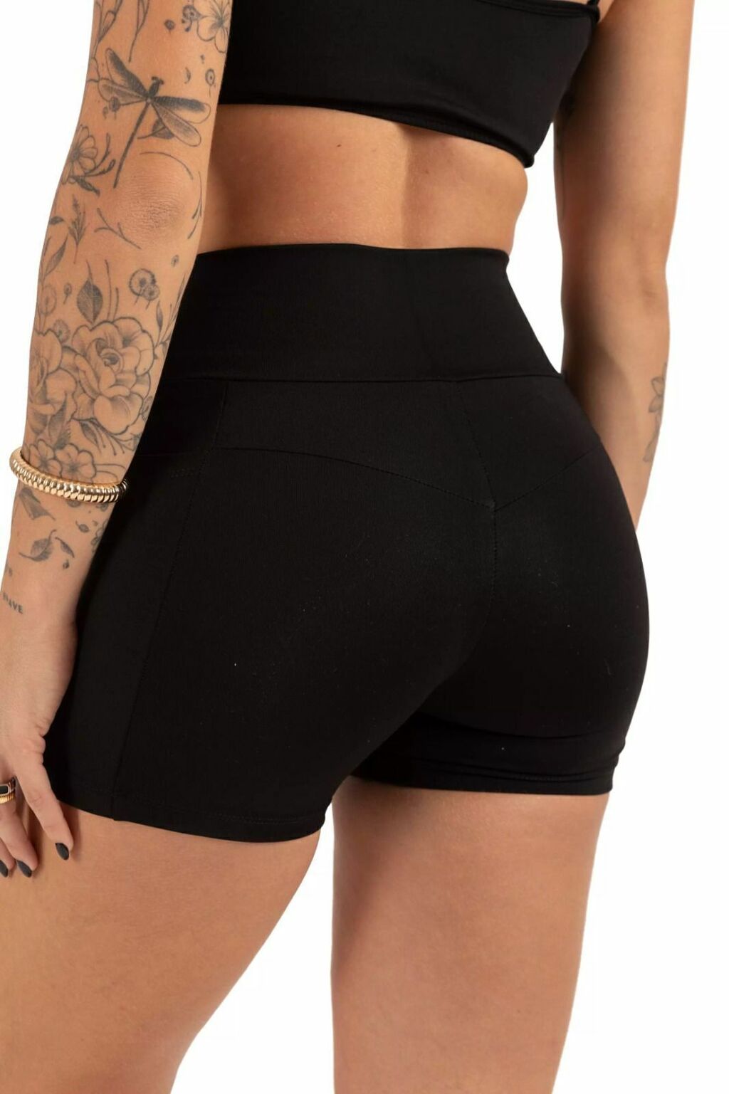 - A Short Essencial possui cós duplo e alto que valoriza o corpo. Devido a ausência de costura central na parte da frente, promove conforto e não marca na região intima. Com bolsos laterais que ajuda no dia a dia, além de um recorde em V no bumbum que trás um up.
